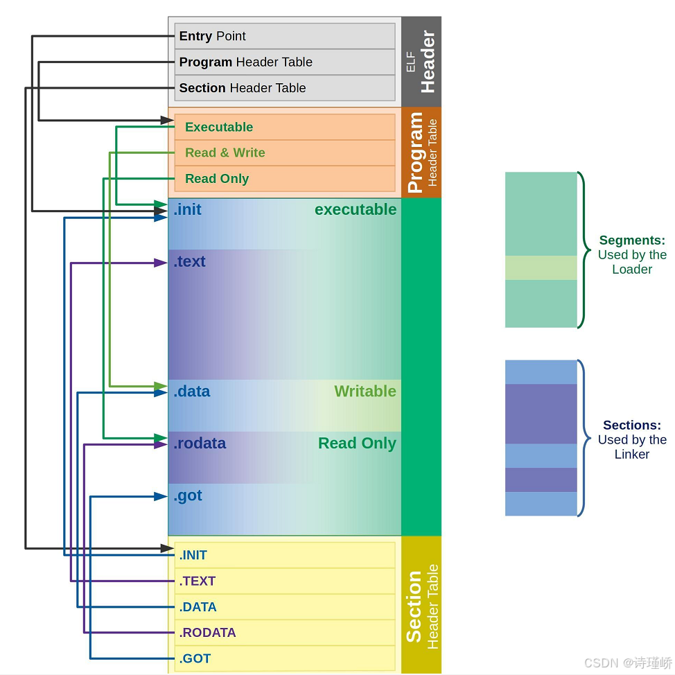 - 操作系统在加载程序时,会将具有相同属性的section合并为一个大的segment,这样就可以实现不同的访问权限,从而优化内存管理和权限访问控制。