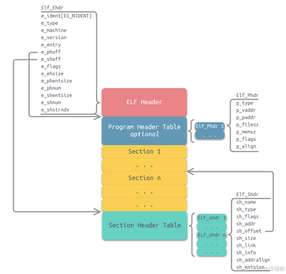 - 程序头表(Program header table):列举了所有有效的段(segments)和他们的属性。表里记着每个段的开始的位置和位移(offset)、长度,毕竟这些段,都是紧密的放在二进制文件中,需要段表的描述信息,才能把他们每个段分隔开。