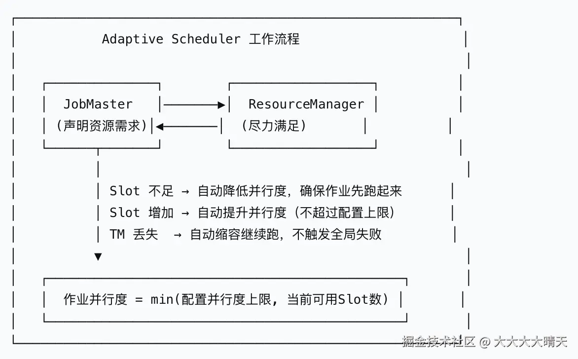 自适应调度器是 Flink 1.13 版本引入的一个特性,它彻底改变了 Flink 的资源调度模型。传统的 Flink 调度器采用 "命令式" 资源管理模式 ------ 作业提交时明确要求 N 个 slot,如果资源不足,作业就无法启动。而自适应调度器采用 "声明式" 资源管理模式 ------ 作业只声明资源需求的上下限,由 ResourceManager 尽力满足。