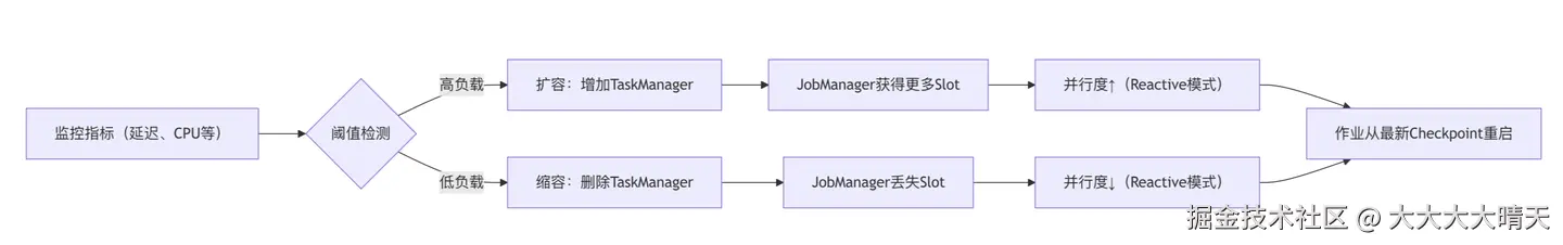 - 调整 TaskManager 数量(粗粒度):通过增减 TaskManager 来改变 Slot 总供给。