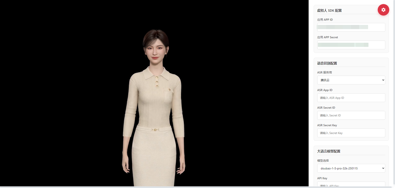 在Demo的配置面板中填入你的AppID、AppSecret,以及腾讯云ASR配置(用于语音识别)和LLM配置(用于智能对话)。