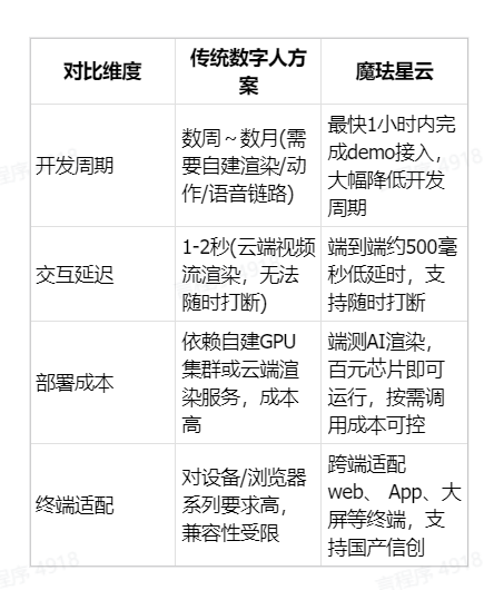 当前行业普遍面临交互体验与工程成本的双重困境:普通数字人依赖云端渲染与视频流推送,不仅响应迟缓,也不支持用户实时打断,难以满足真实对话场景;而自主搭建方案需要串联语音、渲染、动作等多套系统,开发复杂度高、延迟与成本居高不下。