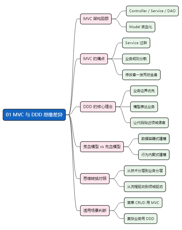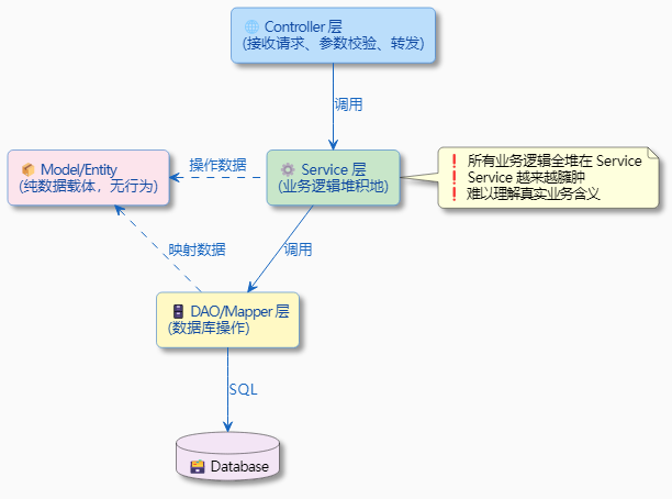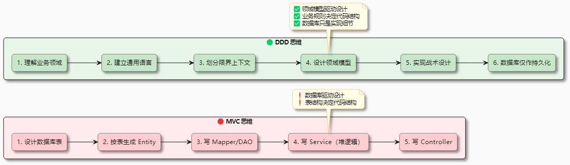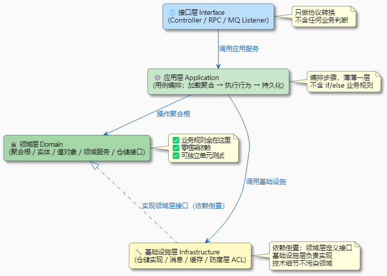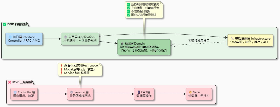 💡 最关键的区别:MVC 的 Service 是业务逻辑的"容器",DDD 的领域层中每个对象都"自己负责自己的业务规则",应用层只做编排。