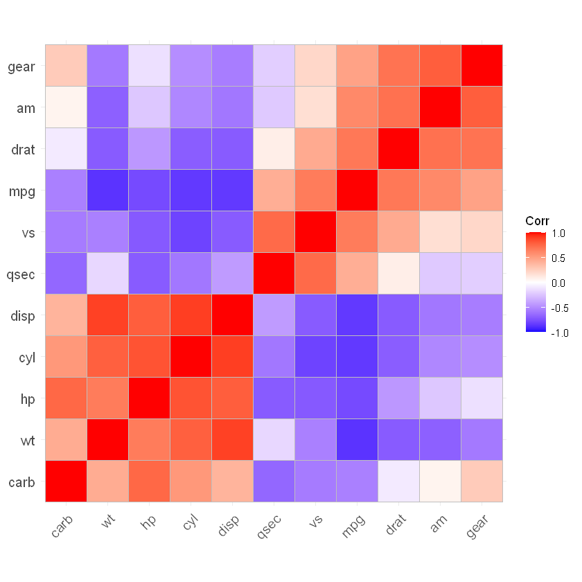 多个变量之间的相关系数矩阵可以用色块图表示, ggcorrplot包提供了这样的功能