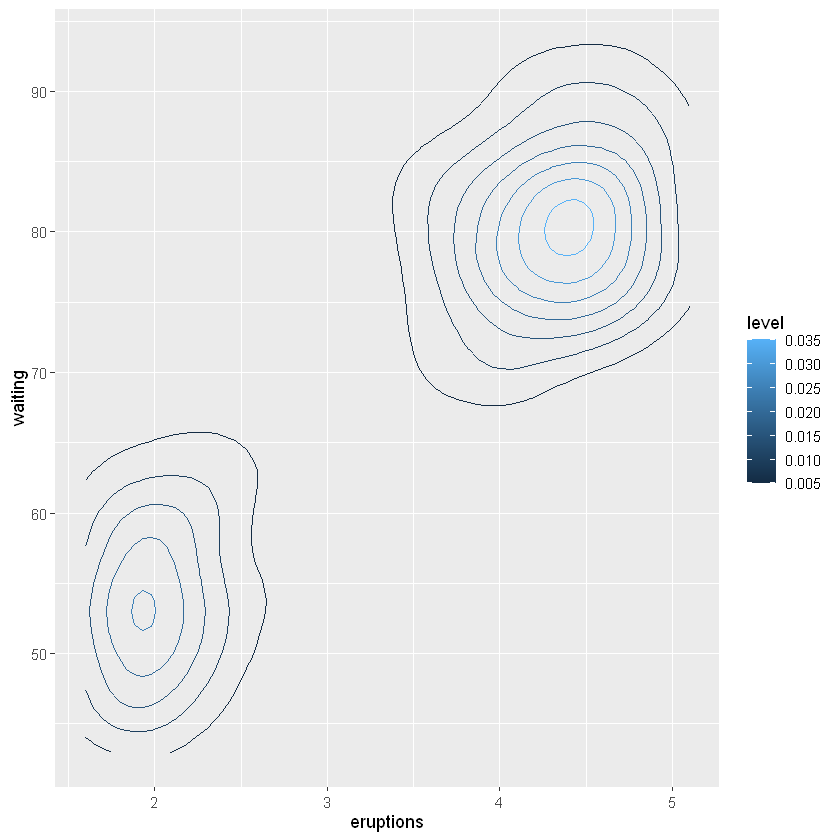 对于已经估计的二元密度曲面, 可以用geom_contour()作等值线图, 用geom_raster()作密度热力图。