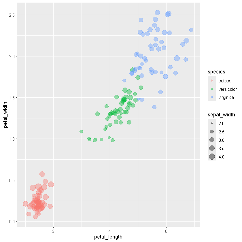 p <- ggplot(data = iris,mapping = aes(x = petal_length,y=petal_width,color=species,size=sepal_width))