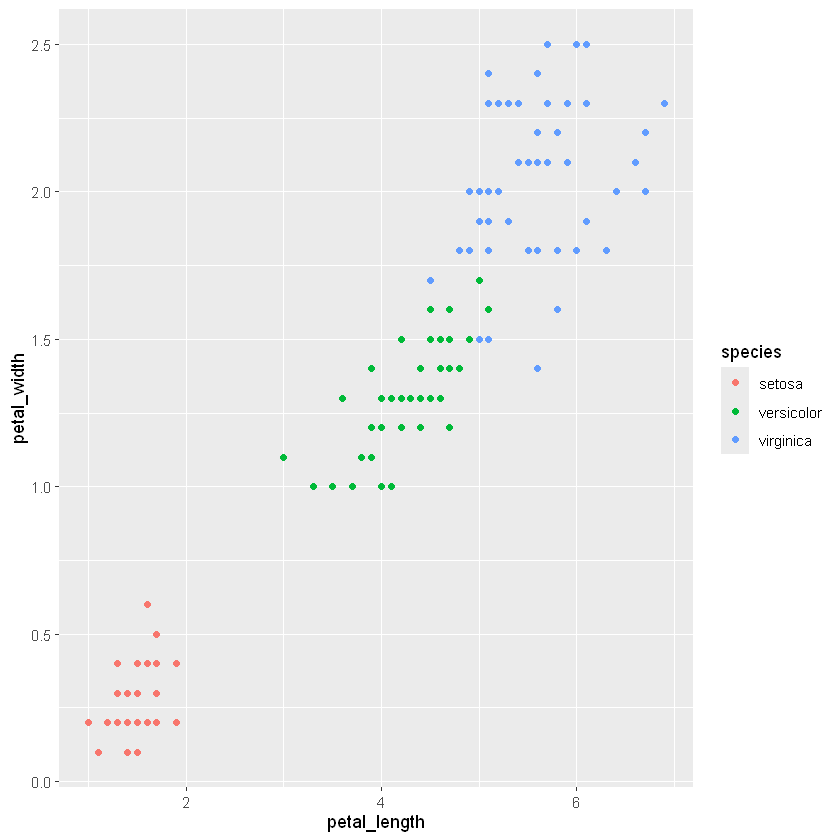p <- ggplot(data = iris,mapping = aes(x = petal_length,y=petal_width,color=species))
