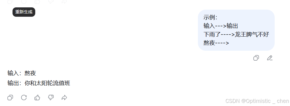 其实就算我们尽全力完善提示词,AI有可能还是无法理解我们的要求。问题不再AI,而是你描述的还不够准确,你可以给它一份样例,让AI知道答案是哪种样子,让AI学习这种样式的回答,之后再提问就可以得到你意料之中的回答了。