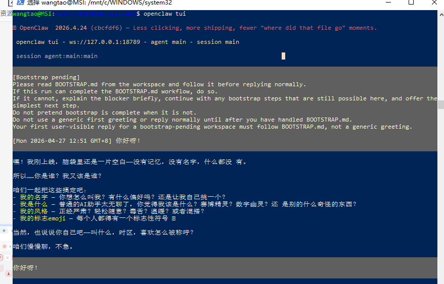 - 成功后会显示 connected to gateway,输入 你好 测试模型回复