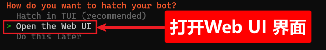 同时,大约过30秒左右,我们回到刚才的设置窗口,选择 Open the Web UI ,打开 OpenClaw 的UI界面: