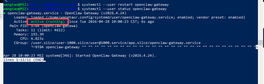 批准对话:在 WSL 终端输入 openclaw pairing list 查看待批准的请求,然后执行 openclaw pairing approve <配对码> #进行授权 。