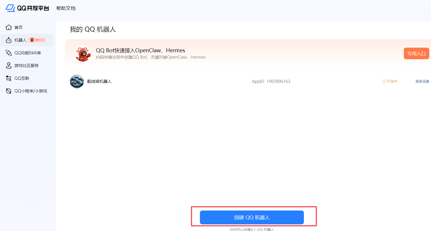 1.首先需要自己去注册QQ开发平台帐号进入之后 选择创建QQ机器人