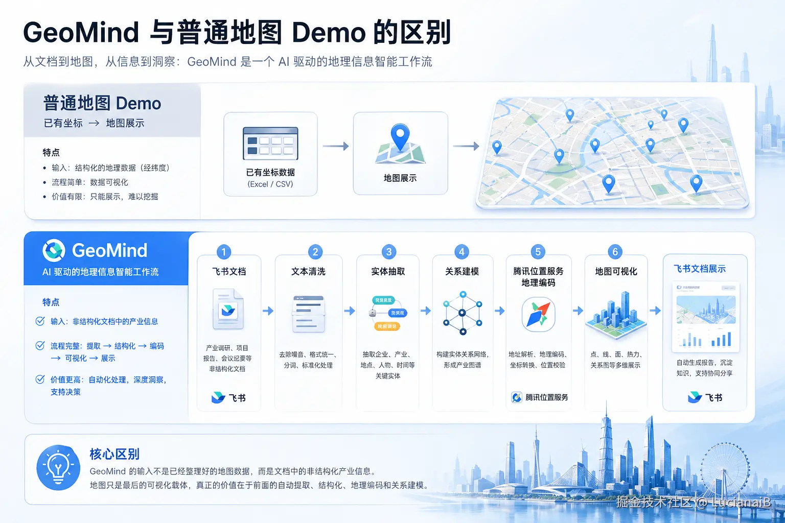 区别在于**,GeoMind 的输入不是已经整理好的地图数据,而是文档中的非结构化产业信息。地图只是最后的可视化载体,真正的价值在于前面的自动提取、结构化、地理编码和关系建模。**