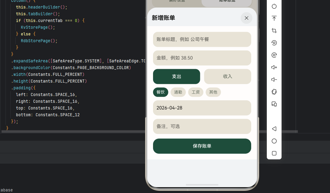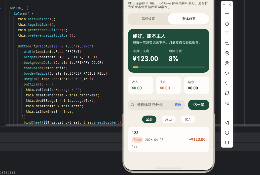 这篇文章我不打算只讲 API,而是基于官方示例写一个"轻账本"应用,然后带你从 0 到 1 把 HarmonyOS 本地存储真正串起来。