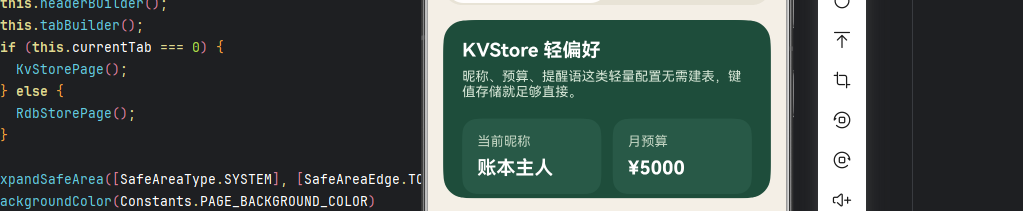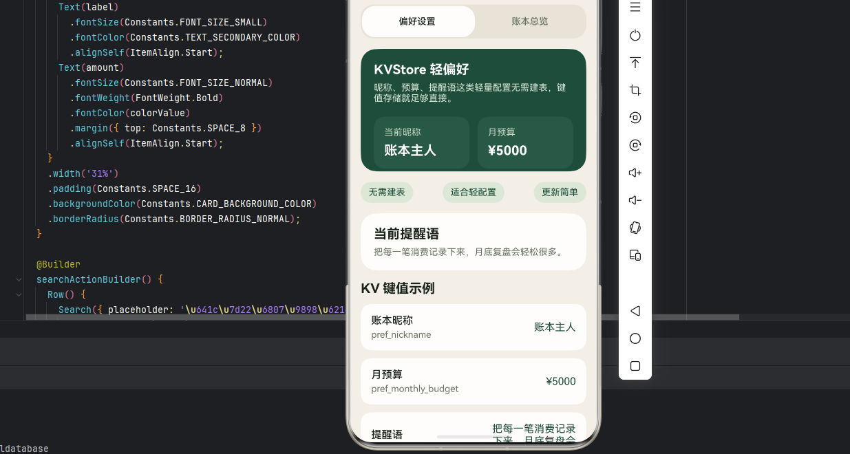 RDB负责账单明细KVStore负责偏好设置- 页面层只关心"怎么展示"和"什么时候刷新"