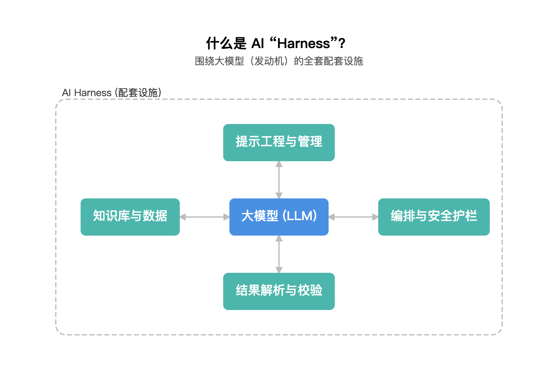 在讨论技术选型前,我们先统一一下"行话"。AI "Harness"这个词没有官方定义,它在工程领域通常指用于"驾驭"和"约束"核心组件的支撑系统。在 AI 应用开发中,Harness 是围绕大模型(LLM)这台"发动机"的配套设施,包括: