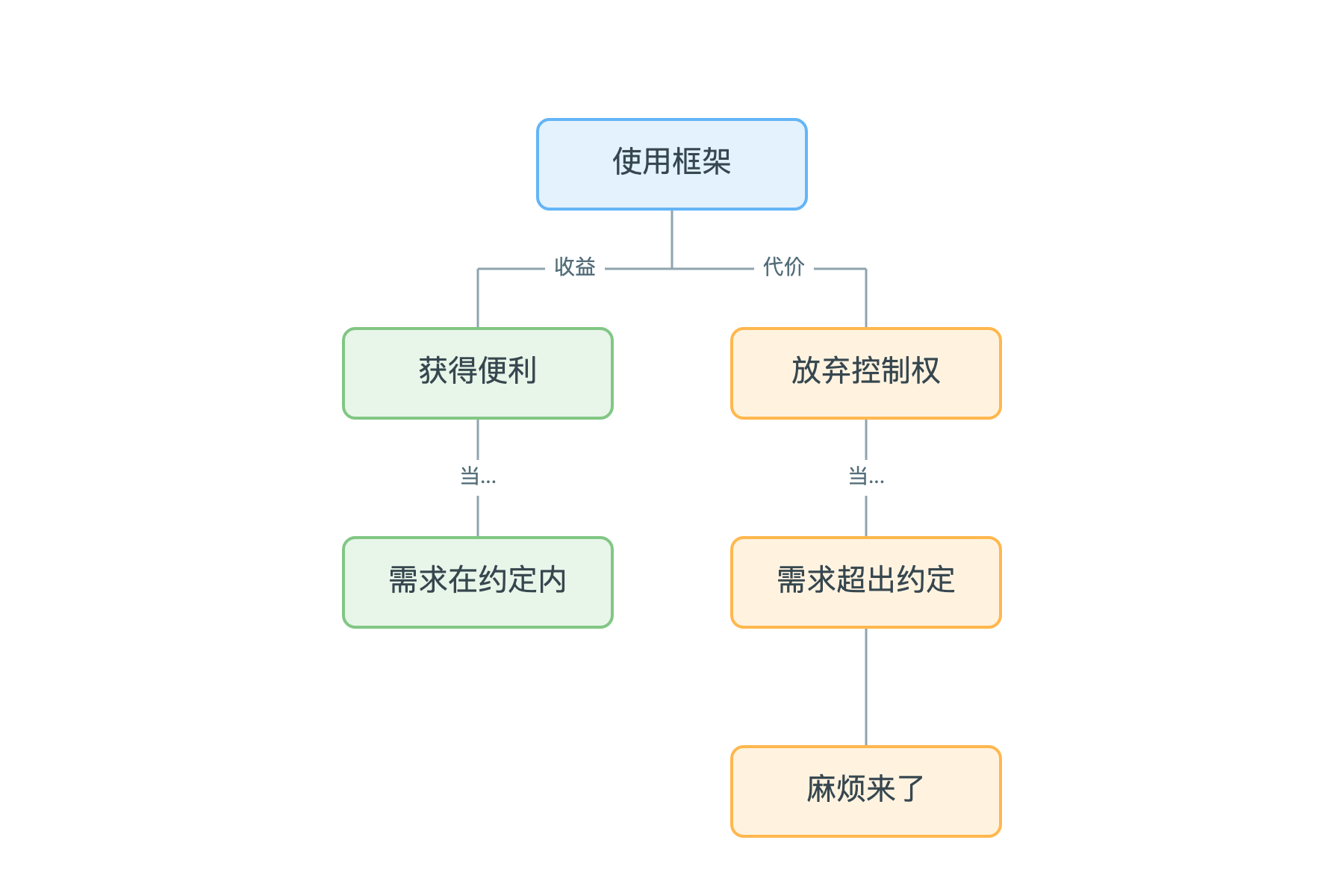 框架的代价 这种便利的代价,是你放弃了部分控制权。框架这套"乐高"积木用起来方便,但也定下了规矩:你只能用它提供的积木,并按它指定的方式拼接。"约定优于配置"的另一面是,一旦需求超出"约定"范围,麻烦就来了。