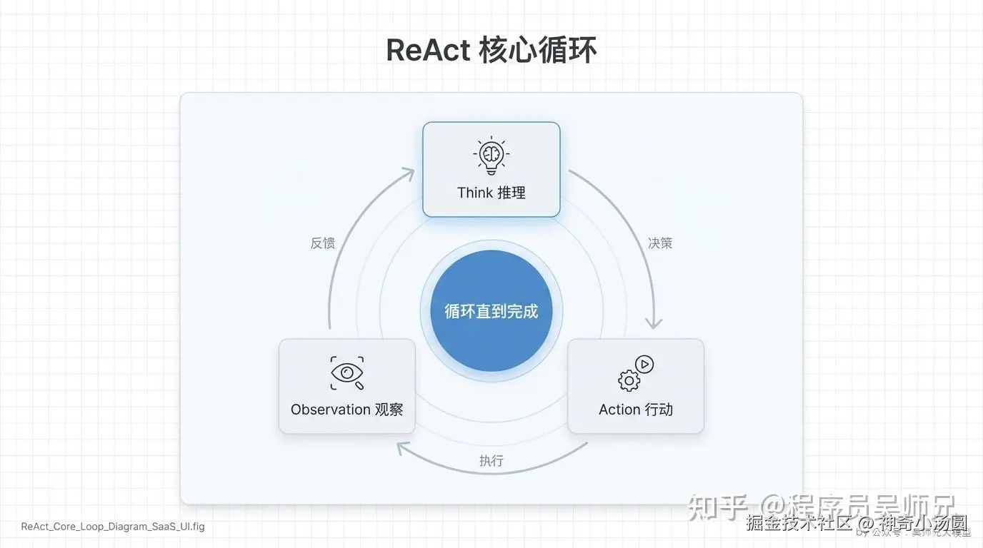 ReAct 把两者结合起来:推理(Reasoning)告诉模型"为什么要这么做",行动(Acting)让模型"真的去做",观察(Observation)让模型"看到做的结果",然后继续推理。这个循环可以重复多次,直到任务完成。