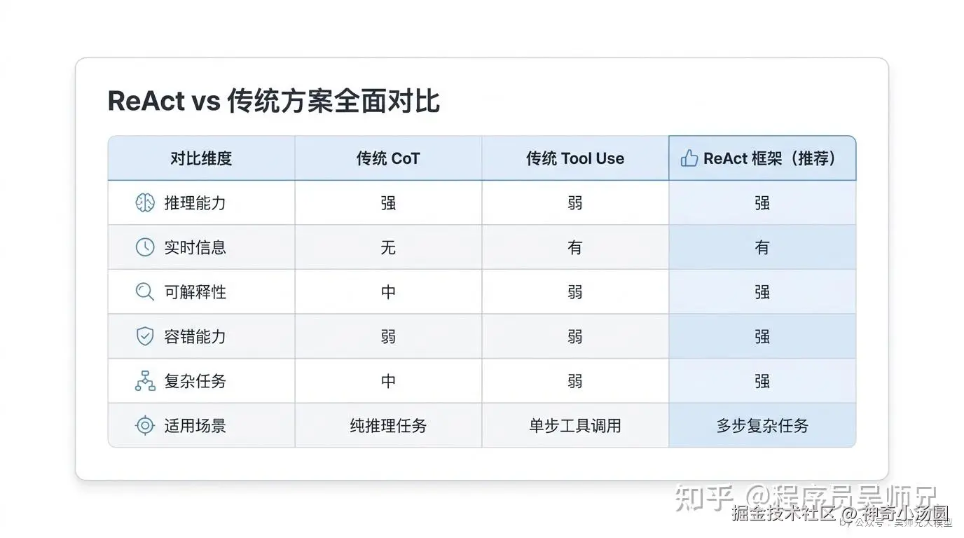 | 对比维度 | 传统 CoT | 传统 Tool Use | ReAct 框架 |