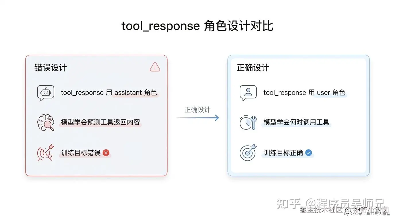 如果把 tool_response 也放在 assistant 角色下,模型在训练时会学到"我应该预测搜索引擎会返回什么内容",而不是"我应该在什么时候调用什么工具、用什么参数"。这是 Agent 训练和普通 LLM 训练最大的区别之一。