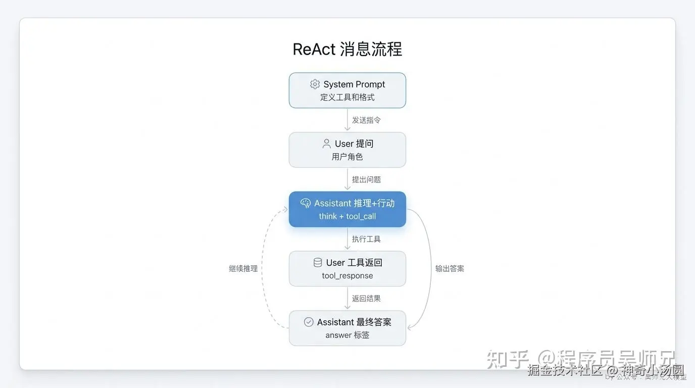 工程实现上,ReAct 用一套标签体系来结构化这个循环:<think> 包裹推理过程,<tool_call> 包裹工具调用参数,<tool_response> 包裹工具返回结果,<answer> 包裹最终答案。关键设计:tool_response 必须用 user 角色传回,因为它是外部世界的反馈,不是模型自己生成的内容。