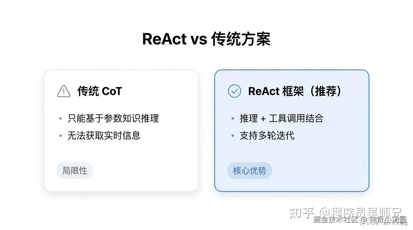 第三个优势:支持复杂任务。对于需要多步推理的任务(比如"对比A和B的优缺点"),ReAct 可以先搜A、再搜B、再对比,每一步都有明确的目标。传统模式要么一次性把所有信息塞给模型(上下文爆炸),要么只能做简单的单步任务。