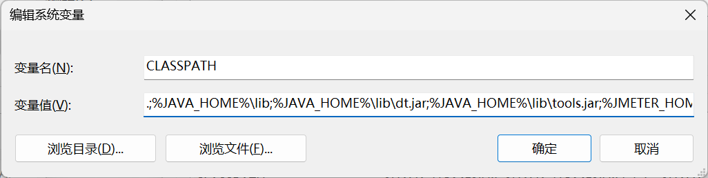 CLASSPATH,变量值输入.;%JAVA_HOME%\lib\dt.jar;%JAVA_HOME%\lib\tools.jar(注意开头的"."不能省略,代表当前目录),点击「确定」。