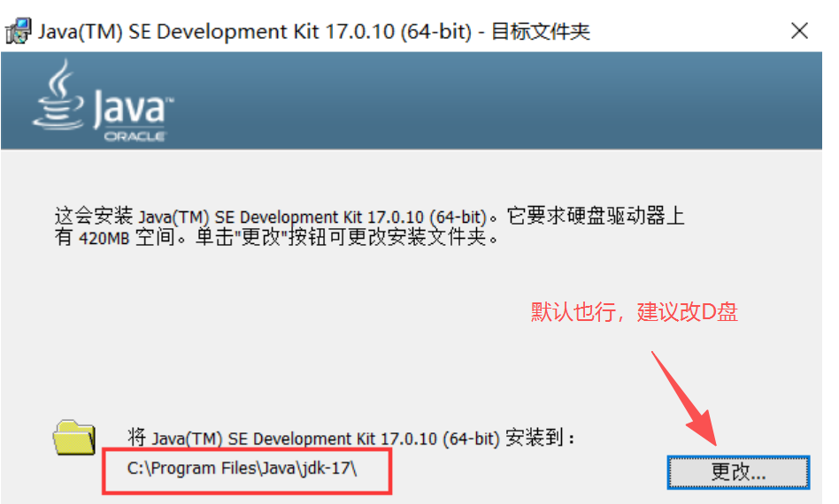选择安装路径(重点!):默认路径为「C:\Program Files\Eclipse Adoptium\jdk-17xxx」,建议修改为简单路径(如「D:\Java\jdk17」),路径中不要包含中文、空格或特殊符号 ,否则会导致环境变量配置失败,修改后点击"Next"。