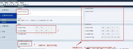 然后配置通信报文为西门子报文111(P922=111) ,这是EPOS控制的标准报文。之后点击"设置PROFINET→配置网络",设置V90的IP地址和设备名称,设备名称一定要与TIA Portal项目中配置的完全相同,保存参数后需重启驱动器才能生效。