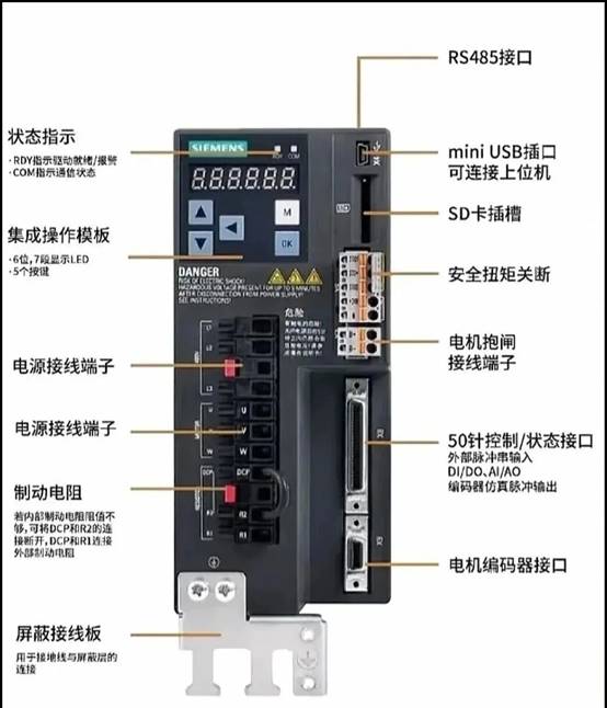 V90伺服驱动器背面有动力输出端子U/V/W和PE,对应连接到伺服电机的动力线。编码器线缆一端插在电机侧,另一端接入驱动器的X2编码器接口。