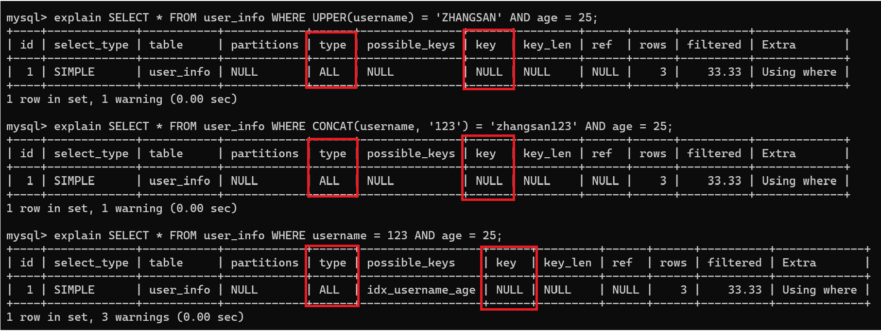 -- 执行计划验证(能看到 type=ALL 表示全表扫描)