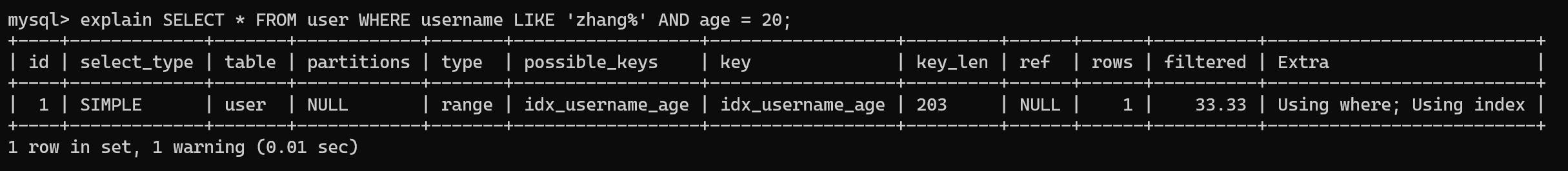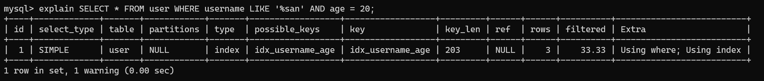 -- 索引失效(只用到 age,跳过了最左的 username)