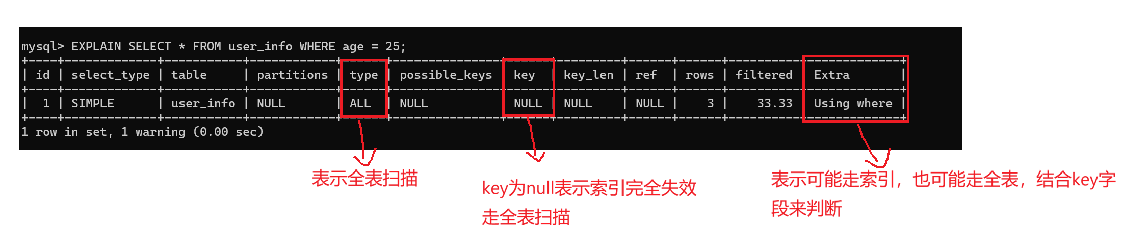 EXPLAIN SELECT * FROM user_info WHERE age = 25;
