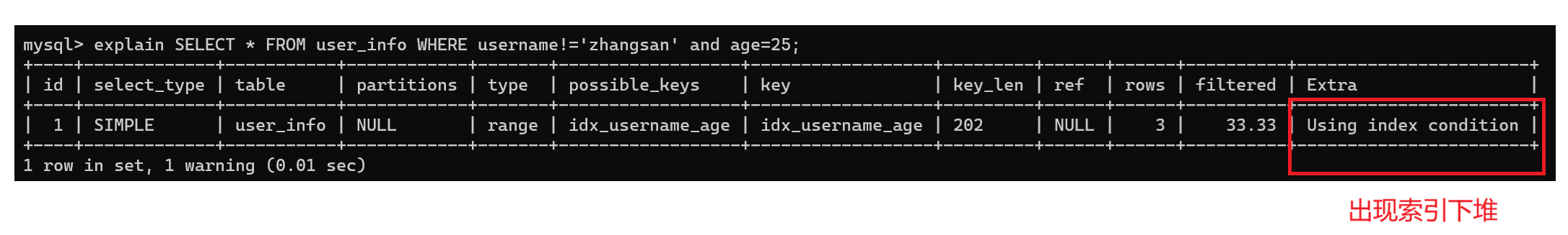 首先在索引中找到username!='zhangsan'的数据行,然后将从索引中获得的每一条数据行都进行一遍回表,最终在得到的结果集中去筛选age=25的数据行
