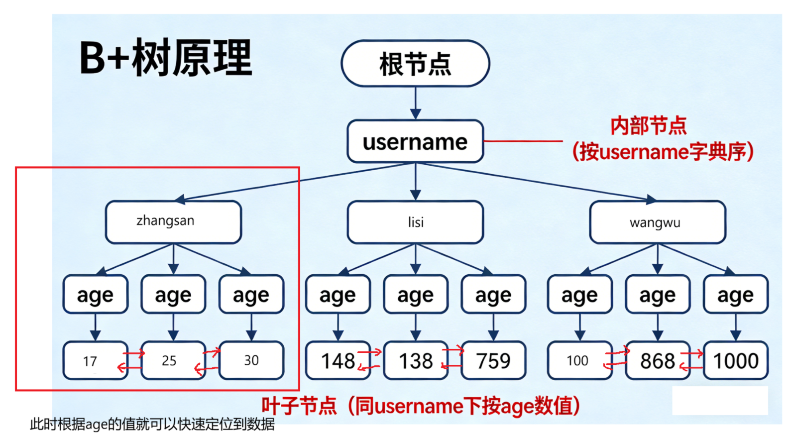 此时上面这条sql中,age索引是生效的,对应到B+树中,在叶子节点的一条数据双向链表中,根据age的有序性,快速定位到数据,如下图
