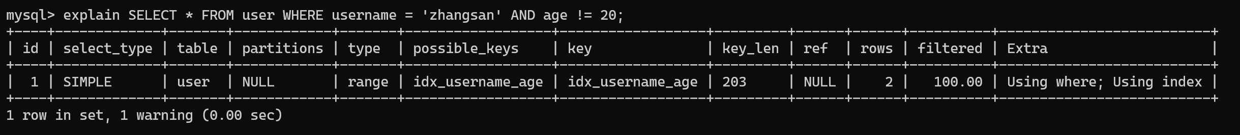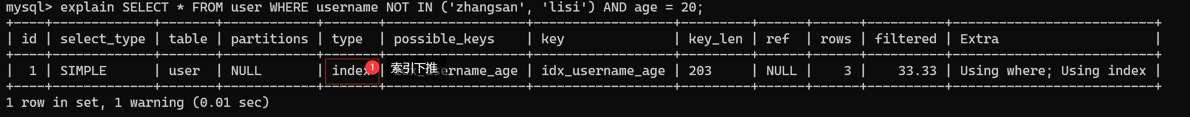 -- 反例(生效):age 用 NOT IN,username 等值查询,索引生效