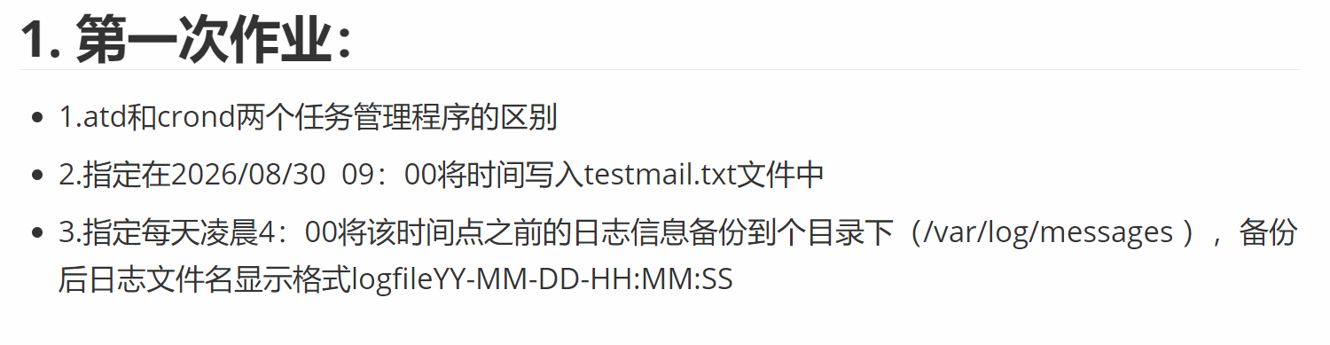 | 日志记录 | |--------------------------------| | 日志在 /var/log/cron(标记为 atd) | | 日志在 /var/log/cron(标记为 CROND) |