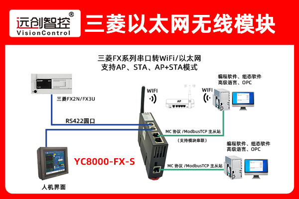 针对上述痛点,经多轮技术论证、性能测试与兼容性验证,最终选用远创智控YC8000-FX-S无线以太网模块作为核心通讯转换设备。该模块专为三菱FX系列PLC量身设计,型号中"S"代表无线功能,完美适配自动化工厂无线部署场景,核心技术优势如下: