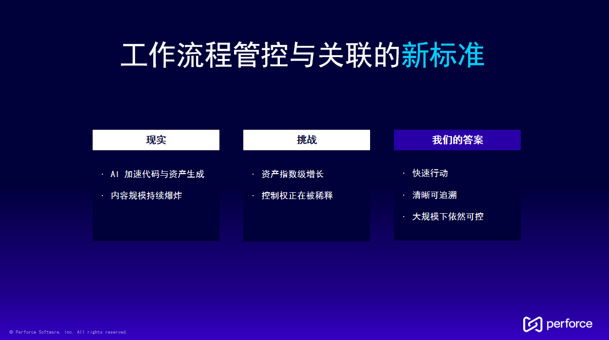 首先来看一下行业背景,大家都知道 AI 的发展非常迅速,很多工作室已经在广泛使用 AI。AI 自动生成的代码和数字资产比人类手动创建的速度快得多,资产呈指数级增长。在这样的背景下,工作室如何高效管理这些资产并对其保持绝对的掌控?因为当数据爆炸之后,权限的管理和工作流程的管理很容易陷入混乱状态。
