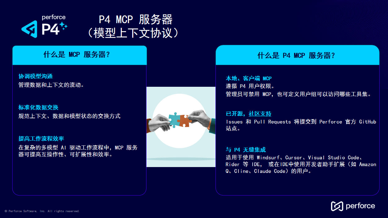 打个比方,AI 很聪明,但它不知道你公司的内部系统怎么用。而像 P4、P4 DAM、P4 Code Review 功能很强大,但它们不理解人类语言。通过 MCP 服务器,它充当了"翻译官"和"能力说明书"的角色,作为一个安全的代理把这两端整合起来。通过标准化的方式传递上下文、数据和模型运行状态,你可以用自然语言下达指令,让 AI 到版本控制系统后台执行操作,而不再仅停留在对话层面。通过这种方式,MCP 大大提升了在复杂多模型环境下的互操作性、可扩展性以及整体效率,最终目的是构建更加高效、可落地的 AI 驱动工作流程。