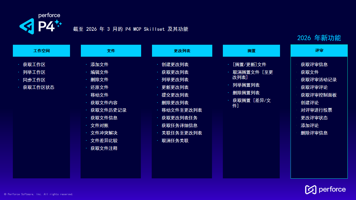 P4 MCP 的使用场景绝对不止这些。大家可以去 GitHub 上下载 MCP 服务器投入试用,并给我们反馈。今年我们还会对它进行新一轮的重大更新,非常想知道大家想让 AI 帮忙做什么。后续的技能集(Skill Set)也会根据大家的需求增加新能力。截止到 3 月份,P4 MCP 支持的技能集共分为五大类:工作区、文件、Changelist、Shelving 以及 Code Review。