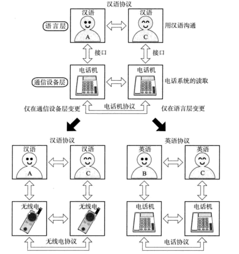 **①.封装。**上层的协议不需要了解下层协议的细节。通过上图可以看出,打电话的人,只需要会说话就行了,不需要理解电话机的工作原理。