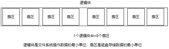 通过目录项和索引节点,就可以一层一层的找到我们需要的文件,那么我们看到的文件内容又是如何存储的呢?首先,对于磁盘来说,数据存储的最小单位是扇区,一个扇区的大小为513B,如果文件系统每次都以扇区为单位来读写数据,那速度可就真的苍了个天了!所以,文件系统定义了逻辑块的概念,一个逻辑块4k,也就是包含8个扇区: