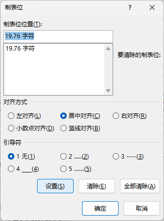 这里我们要科普一个小知识。个人理解:制表位是每一行word渲染你要往那个里面塞的内容的渲染中心,且计算起始点是左页边距,我们一共要设置两个指标位:行正中与右侧页边距。前者放居中的公式后者则是靠右的编号。