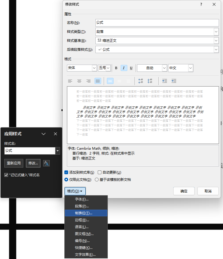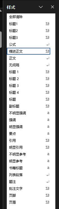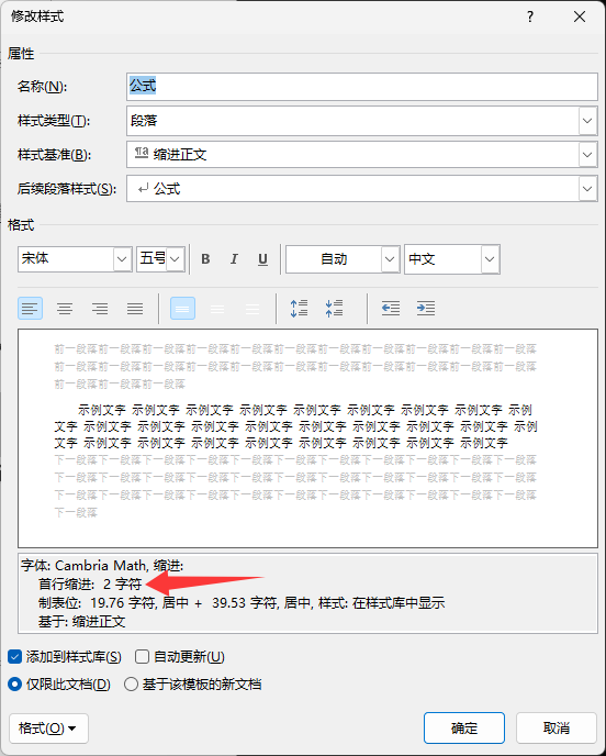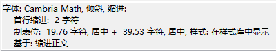这个段前有两个字符是因为我的公式样式的样式基准是缩进正文样式。这个首行缩进2字符是继承(?)来的,因此一般来说写文章的时候建议有两个正文备用。一个设置了首行2字符用来写自然段,另一个用来承载图或者表或者其他插入项。