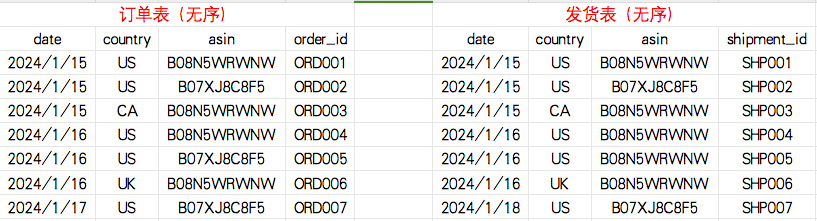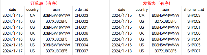 - 如果订单表指针i指向的数据的date、country、asin字段的键值 > 发货表指针j指向的数据的date、country、asin字段的键值,指针j++