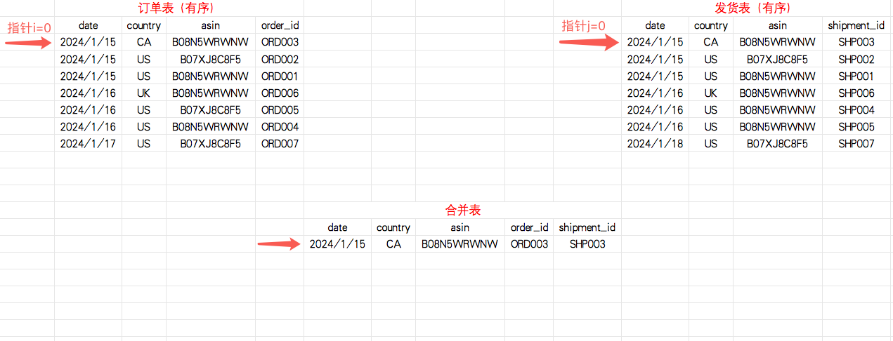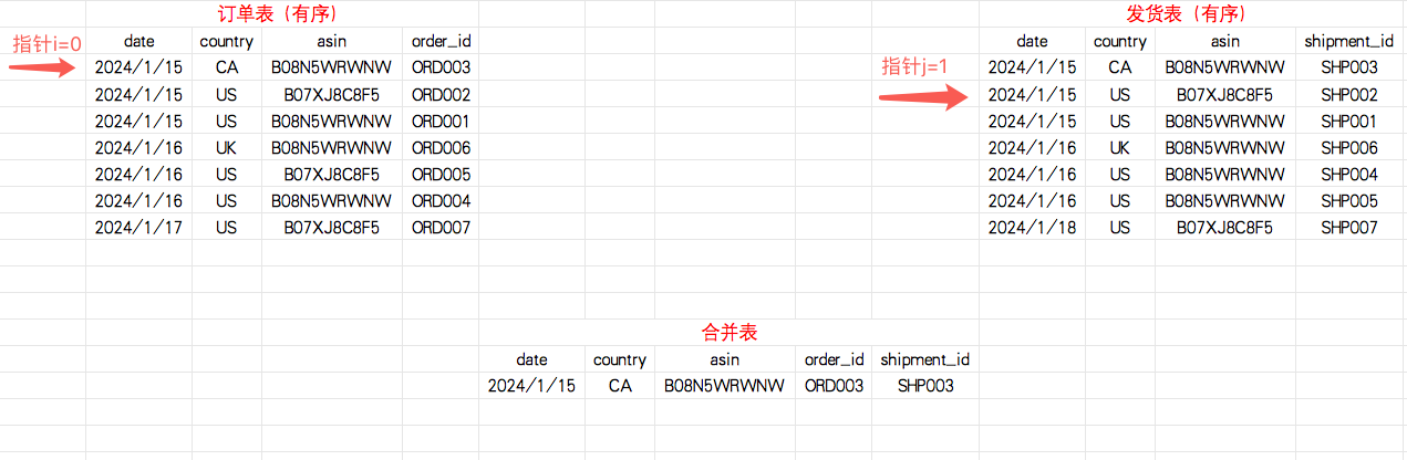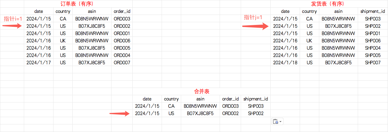 - 如果订单表指针i指向的数据的date、country、asin字段的键值 < 发货表指针j指向的数据的date、country、asin字段的键值,指针i++