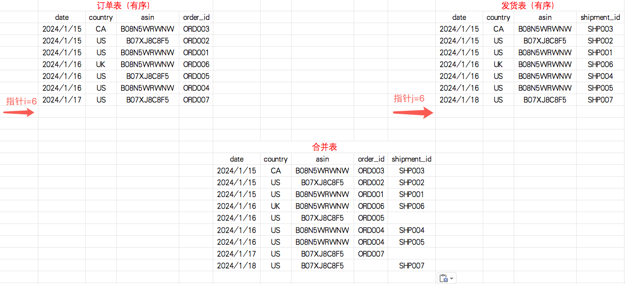 - 如果订单表指针i指向的数据的date、country、asin字段与发货表指针j指向的数据的date、country、asin字段一致,将两条数据合并,输出到合并表,指针j++(指向下一条数据)