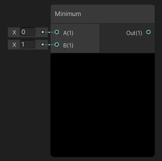 Minimum 节点的功能非常直观且专一:它接收两个输入值 A 和 B,经过内部比较后,输出这两个值中较小的一个。这种操作在数学上称为"最小值函数",在编程中通常表示为 min(A, B)。