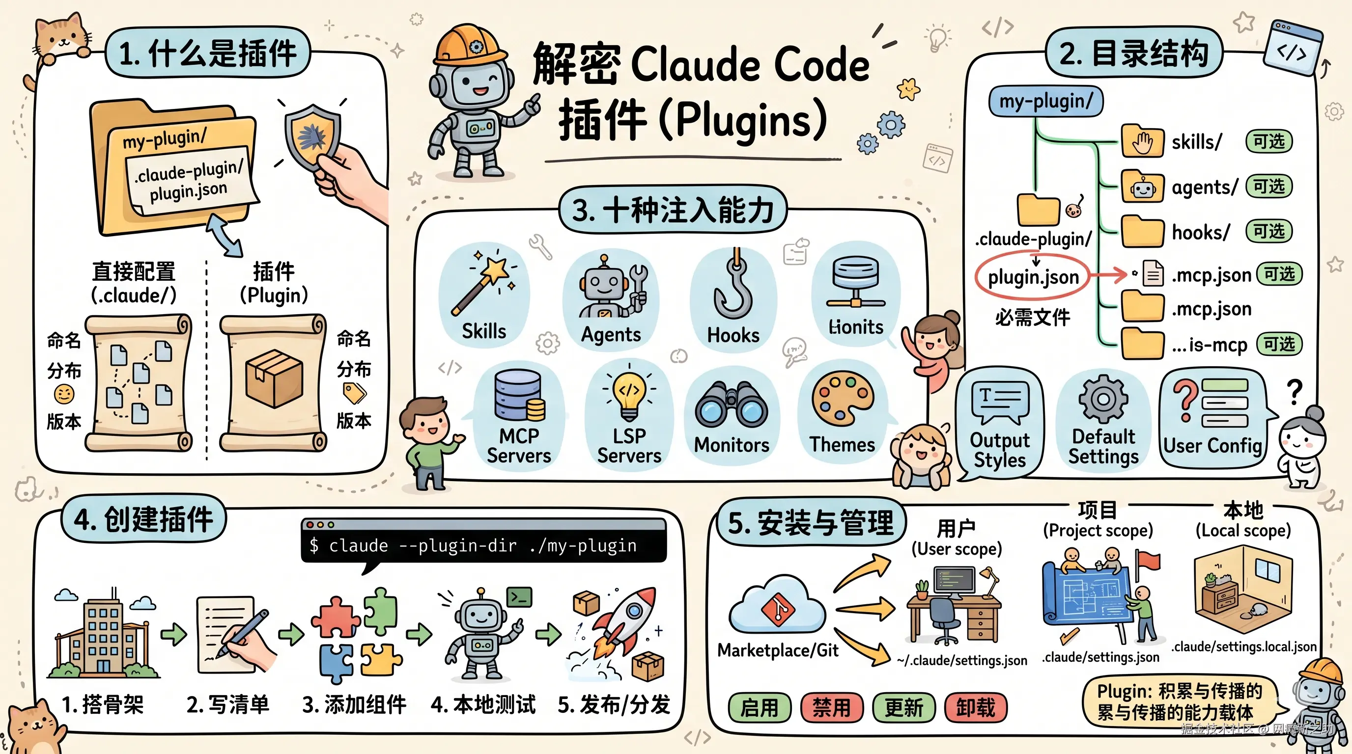 一句话:Plugin 是一个包含 .claude-plugin/plugin.json 清单文件的目录,可以向 Claude Code 注入最多十种能力。
